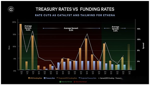 Another unique aspect of the Ethena strategy is its mild negative correlation with the federal funds rate.Unlike Treasury-backed stablecoins, Ethena is expected to benefit from falling interest rates – because low interest rates stimulate economic activity, increase demand for leverage, drive up funding rates, and strengthen the basis trade that supports Ethena’s earnings.A similar situation occurred in 2021, when the spread between the funding rate and the government bond interest rate widened to more than 10%.