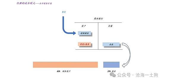 As shown in the figure above, under this system, on the one hand, the central bank expands excess reserves; on the other hand, commercial banks expand credit, and the scale of legal currency debt such as loans and bonds expands.Eventually, we will observe an expansion of deposits and an inflation of risk asset prices (ps: Assuming that risk preference remains unchanged, that is, the cash/risk asset ratio of residents’ willingness).