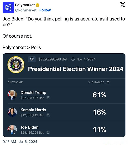 该平台允许交易员围绕无数个“是”或“否”结果创建市场,在混乱而动荡的美国总统大选中,该平台引起了轰动。过去几个月,交易员们希望通过预测哪位候选人将胜出而赚钱,他们在该平台上押注了数亿美元,将Polymarket 的业务指标和知名度推向了历史新高。