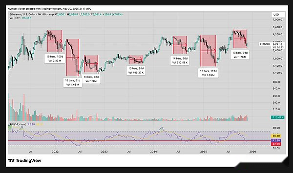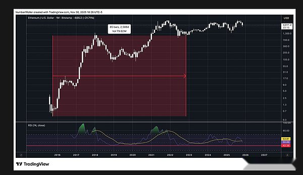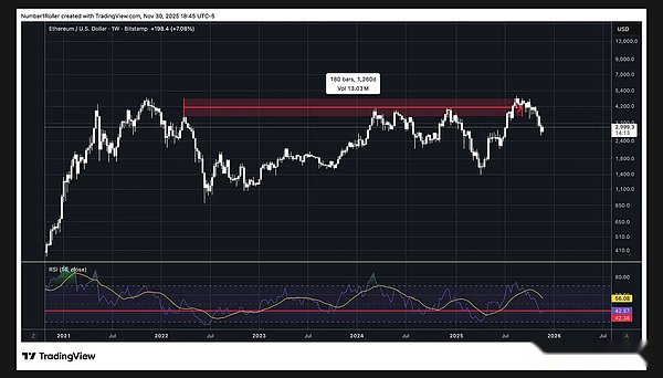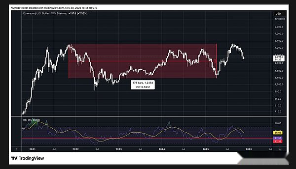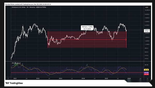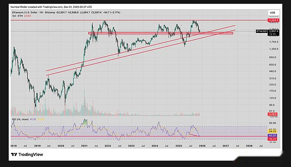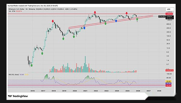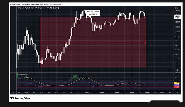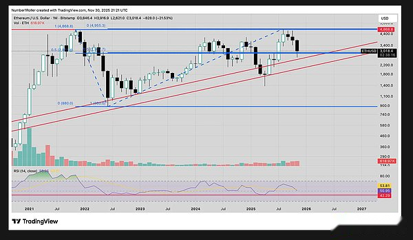 Tout d’abord, prenons une vue panoramique du cycle mensuel d’Ethereum, puis concentrons-nous sur la tendance actuelle.Nous pouvons comprendre pourquoi décembre est susceptible de devenir un nœud clé de retournement.