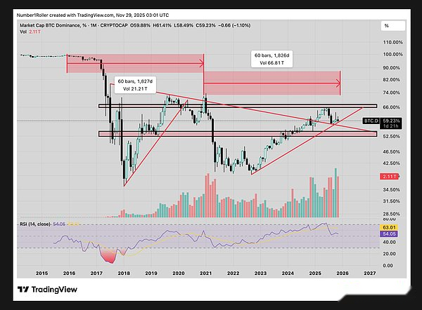 Ce cycle montre que le cycle « de haut en haut » de BTC.D est de 60 mois, et le mois prochain (décembre 2025) se trouve être le 60e mois après le sommet de décembre 2020.