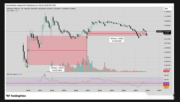 En regardant le taux de change ETH/BTC, nous avons également marqué chaque mois de décembre depuis sa naissance.Parmi les 7 grands tournants du mois de décembre, 5 étaient des points bas, et la plupart des mois de décembre ont marqué des tournants mensuels importants.