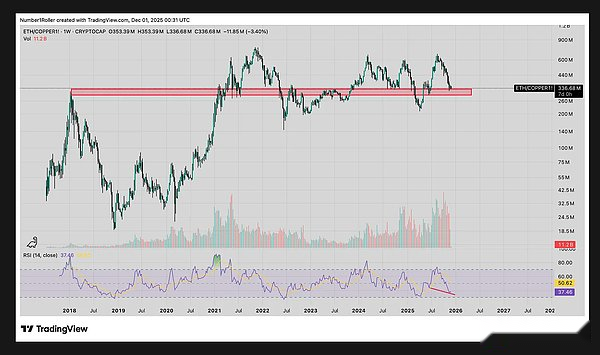 En regardant le graphique hebdomadaire ETH/Cuivre, le ratio s’échange autour de ses sommets de 2017 – un niveau qui constitue un support solide depuis le creux de 2022. Pendant ce temps, une divergence haussière hebdomadaire du RSI est également apparue à ce niveau macro clé.
