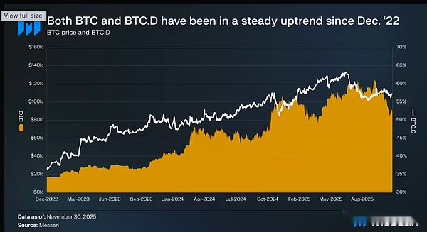 Mais les performances du Bitcoin par rapport aux autres crypto-monnaies sont encore plus révélatrices.Historiquement, lors des marchés haussiers des cryptomonnaies, la part de capitalisation boursière de Bitcoin (BTC.D, le rapport entre la capitalisation boursière de Bitcoin et la capitalisation boursière totale des cryptomonnaies) a diminué à mesure que les fonds se dirigent vers la fin de la courbe de risque ; cependant, dans le marché haussier actuel du Bitcoin, cette tendance s’est complètement inversée.Au cours des trois dernières années, la part de capitalisation boursière du Bitcoin est passée de 36,6 % à 57,3 % – le Bitcoin s’écarte de l’ensemble du marché des cryptomonnaies.