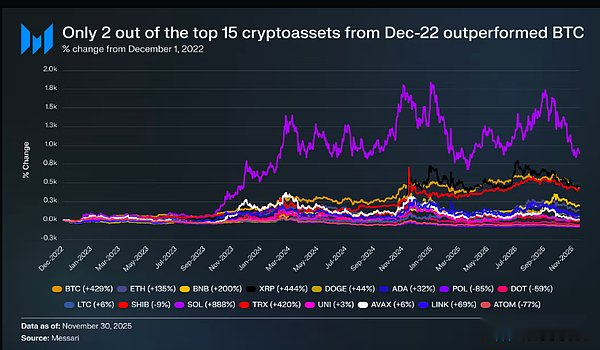Parmi les 15 principaux crypto-actifs au 1er décembre 2022, seuls deux (XRP et SOL) ont surperformé Bitcoin, et seul SOL a réalisé un avantage significatif (en hausse de 888 % par rapport aux 429 % de Bitcoin).Les autres actifs du marché sont nettement à la traîne, de nombreux actifs à grande capitalisation ayant à peine augmenté, voire même diminué au cours de la même période : Ethereum a augmenté de 135 %, le BNB a augmenté de 200 %, le Dogecoin (DOGE) a augmenté de 44 %, tandis que des actifs tels que POL (-85 %), DOT (-59 %), ATOM (-77 %) sont toujours coincés dans le bourbier.Ce qui est plus remarquable, c’est la taille du Bitcoin : en tant qu’actif valant des milliers de milliards de dollars, il aurait nécessité le plus de capital pour faire monter son prix, mais il a quand même surperformé presque toutes les pièces majeures.Cela suggère qu’il existe une pression d’achat réelle et soutenue sur Bitcoin, alors que la plupart des autres actifs se comportent davantage comme des actifs bêta, n’augmentant que lorsque Bitcoin fait grimper le marché global.