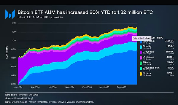 La dynamique des lancements d’ETF en 2024 s’est poursuivie directement en 2025, avec un total d’actifs d’ETF sous gestion augmentant de 20 % d’une année sur l’autre, passant d’environ 1,1 million de Bitcoins à 1,32 million.Ces produits contiennent plus de 120 milliards de dollars de Bitcoin aux prix actuels, ce qui représente plus de 6 % de l’offre maximale de Bitcoin.Plutôt que de s’atténuer après la ruée initiale, la demande d’ETF est devenue une source continue de pression d’achat, continuant d’accumuler du Bitcoin quelles que soient les conditions du marché.