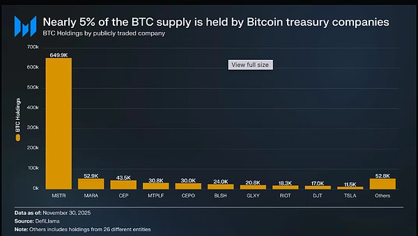 De plus, l’implication institutionnelle s’étend bien au-delà des ETF.En 2025, les trésoreries d’actifs numériques (DAT) sont devenues des acheteurs majeurs, renforçant encore le statut de Bitcoin en tant qu’actif de réserve de trésorerie.Alors que MicroStrategy de Michael Saylor a longtemps été l’exemple le plus frappant d’une entreprise accumulant du Bitcoin, près de 200 entreprises dans le monde ont désormais du Bitcoin dans leur bilan.Les sociétés cotées détiennent à elles seules environ 1,06 million de Bitcoins (5 % de l’offre totale), dont MicroStrategy détient 650 000 Bitcoins, occupant une position dominante absolue.