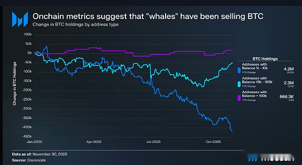 Les indicateurs Bitcoin en chaîne reflètent une situation similaire.Certains des détenteurs les plus importants et les plus anciens (adresses détenant 1 000 à 100 000 Bitcoins) ont été des vendeurs nets tout au long de l’année 2025. Ces adresses détenaient 6,9 millions de Bitcoins (près d’un tiers de l’offre totale) au début de l’année et ont continué à vendre tout au long de l’année : le groupe détenant 1 000 à 100 000 Bitcoins a enregistré une sortie nette de 417 300 Bitcoins.(-9% sur un an), et le groupe détenant entre 100 000 et 1 million de Bitcoins a enregistré une sortie nette supplémentaire de 51 700 Bitcoins (-2% sur un an).
