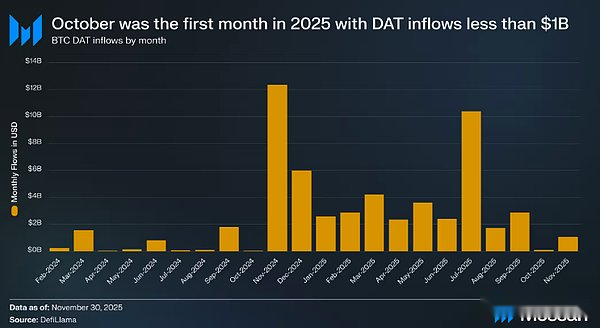 Cette vague d’offre coïncide également avec un ralentissement significatif des principaux flux d’achat qui ont fait grimper les prix du Bitcoin au cours des deux dernières années : les entrées dans les trésoreries d’actifs numériques (DAT) ont fortement chuté en octobre, marquant la première fois en 2025 que les entrées nettes mensuelles dans les DAT étaient inférieures à 1 milliard de dollars ; en revanche, les ETF spot, qui sont restés acheteurs nets tout au long de l’année, se sont tournés vers des vendeurs nets depuis octobre.Avec l’affaiblissement temporaire des DAT et des ETF, les deux principales sources de demande stable pour Bitcoin, le marché a dû absorber simultanément la double pression de la baisse des flux entrants et de la réduction des avoirs des premiers détenteurs.