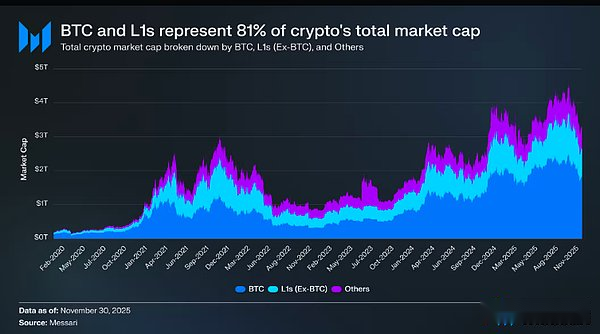 La valeur marchande totale des crypto-monnaies est de 3 260 milliards de dollars américains, dont 1 800 milliards de dollars américains pour le Bitcoin, et environ 830 milliards de dollars américains sur les 1 450 milliards de dollars américains restants sont concentrés dans la chaîne publique L1 (chaîne publique non Bitcoin).Au total, 2,63 billions de dollars de capitalisation boursière (environ 81 % de la capitalisation boursière totale) proviennent de crypto-actifs qui ont été considérés comme des devises par le marché ou sont censés former une prime de change.