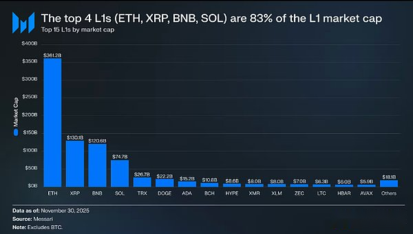 Pour répondre à cette question, nous devons d’abord clarifier le statut actuel de valorisation des chaînes publiques.Les quatre principales chaînes publiques en termes de valeur marchande sont Ethereum (361,15 milliards de dollars), XRP (130,11 milliards de dollars), BNB (120,64 milliards de dollars) et Solana (74,68 milliards de dollars), avec une valeur marchande totale de 686,58 milliards de dollars, soit 83 % du marché de la chaîne publique L1.Après les quatre premiers, la valeur marchande des chaînes publiques a diminué rapidement (Tron Coin a une valeur marchande de 26,67 milliards de dollars), mais elle a encore une certaine ampleur – Avalanche Coin, qui se classe au quinzième rang en termes de valeur marchande, a une valorisation de plus de 5 milliards de dollars.