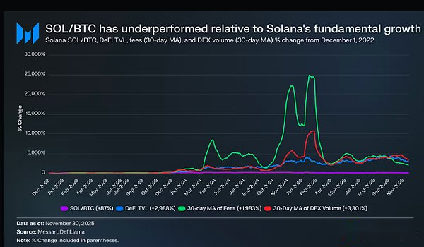 Une analyse approfondie des performances excédentaires de Solana révèle que son taux de croissance ne correspond pas réellement au taux de croissance de l’écosystème.Au cours de la même période où SOL a réalisé des rendements excédentaires de 87 % par rapport à Bitcoin, ses fondamentaux écologiques ont montré une croissance explosive : la valeur de blocage de la finance décentralisée (DeFi) a augmenté de 2 988 %, les revenus de frais ont augmenté de 1 983 % et le volume des transactions d’échange décentralisé (DEX) a augmenté de 3 301 %.Selon toute mesure raisonnable, Solana et l’écosystème ont été multipliés par 20 à 30 depuis le 1er décembre 2022. Cependant, SOL, qui est censé véhiculer la valeur de la croissance écologique, a un rendement excédentaire de seulement 87 % par rapport à Bitcoin.
