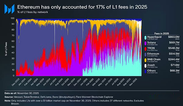 Aujourd’hui, nous sommes suffisamment confiants pour affirmer que cette logique simple de capture de valeur ne se réalisera pas. Les revenus des commissions d’Ethereum ont fortement chuté et il n’y a aucun signe de reprise ;dans le même temps, les domaines de l’écosystème Ethereum à la croissance la plus rapide (tokénisation d’actifs du monde réel, affaires institutionnelles) utilisent principalement le dollar américain comme devise de base, et non les jetons Ethereum.