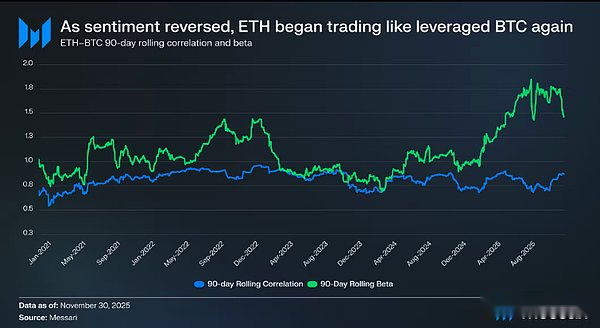 Tout cela a ramené le débat sur l’Ethereum à sa contradiction fondamentale : l’Ethereum accumule peut-être effectivement une prime monétaire, mais cette prime a toujours été à la traîne par rapport au Bitcoin.Le marché considère une fois de plus Ethereum comme une « expression à effet de levier » du récit monétaire de Bitcoin plutôt que comme un actif monétaire indépendant.Tout au long de 2025, la corrélation glissante sur 90 jours d’Ethereum avec Bitcoin a constamment fluctué entre 0,7 et 0,9, tandis que son bêta glissant a atteint des sommets pluriannuels, dépassant même 1,8 à certaines périodes.Cela signifie que les fluctuations de prix de l’Ethereum sont plus importantes que celles du Bitcoin, mais la tendance reste fortement dépendante du Bitcoin.