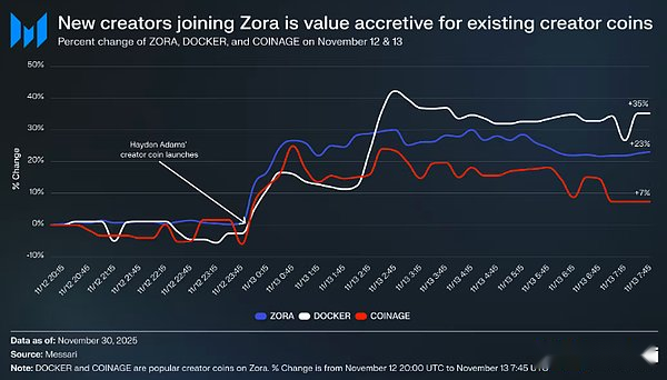 Cet effet a été vérifié dans la réalité : le 12 novembre, Hayden Adams, fondateur de l’échange décentralisé Uniswap, a créé une page d’accueil personnelle sur Zora et a émis les jetons de créateur correspondants.Avant de créer la page d’accueil, le prix de ZORA était de 0,055 $ ; Quelques heures après la création de la page d’accueil, le prix du ZORA a atteint un sommet de 0,071 $ ; Dans les 8 heures qui ont suivi la création de la page d’accueil par Hayden Adams, le prix du ZORA était encore 23 % plus élevé qu’il y a 12 heures.Pendant ce temps, d’autres jetons de créateurs populaires sur la plateforme Zora, tels que DOCKER et COINAGE, ont également gagné respectivement 35 % et 7 % au cours des mêmes 12 heures.