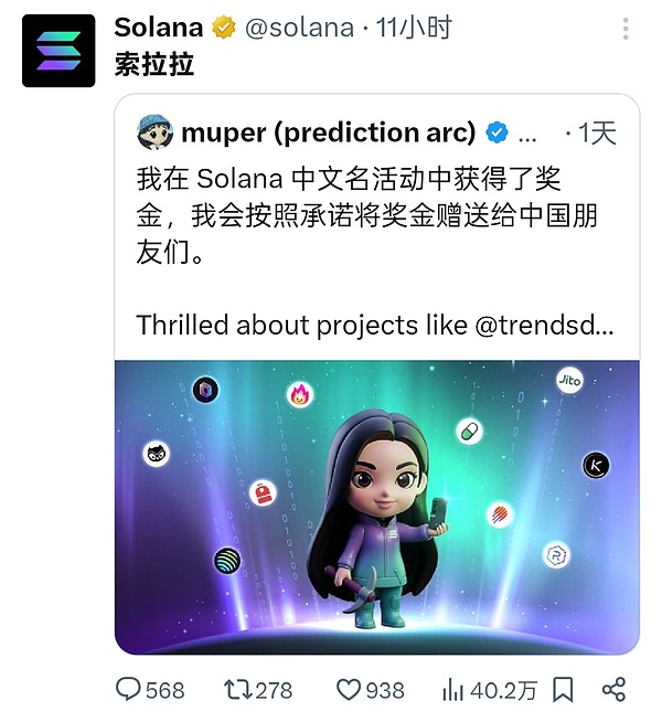 El 20 de octubre, la cuenta oficial X de Solana reenvió y confirmó oficialmente su nombre chino: “Solala”.En el contexto actual de locura china por la comunidad global de cifrado, se ha convertido en un evento cultural de gran significado simbólico.