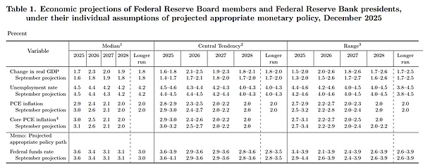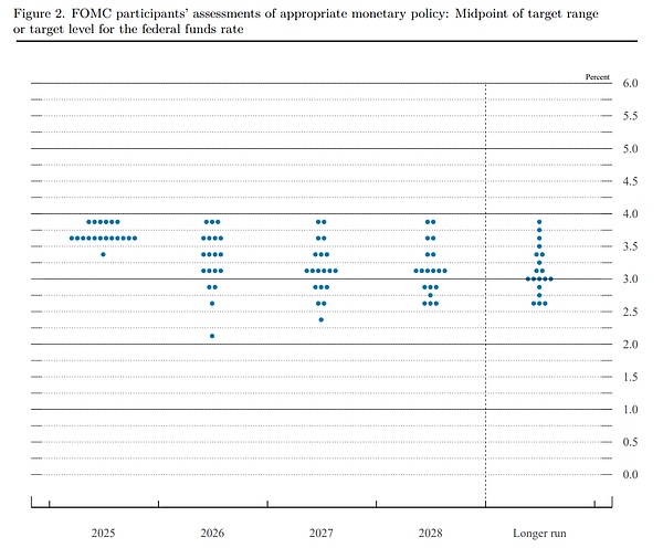Los participantes del FOMC escribieron sus evaluaciones personales sobre la trayectoria adecuada para la tasa de fondos federales, basándose en lo que cada participante consideraba el escenario económico más probable.La mediana de las previsiones entre los participantes fue que el nivel adecuado para la tasa de los fondos federales sería del 3,4% a finales de 2026 y del 3,1% a finales de 2027, sin cambios desde septiembre.