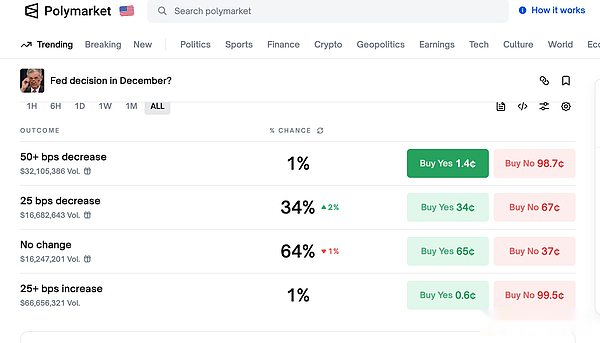 According to CME’s “Fed Watch”: the probability that the Federal Reserve will cut interest rates by 25 basis points in December is 39.6%, and the probability of keeping interest rates unchanged is 60.4%.The probability that the Fed will cut interest rates by 25 basis points cumulatively by January next year is 50.2%, the probability of keeping interest rates unchanged is 29.7%, and the probability of cumulative interest rate cuts by 50 basis points is 20.2%.In addition, Polymarket data shows that the probability of “the Federal Reserve cutting interest rates by 25 basis points in December” fell to 34%, and the probability of keeping interest rates unchanged rose to 64%.