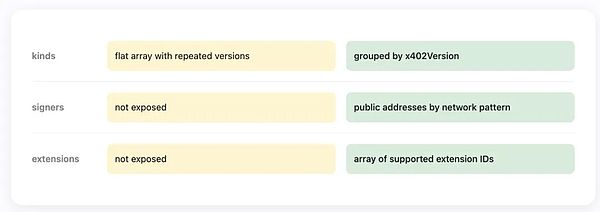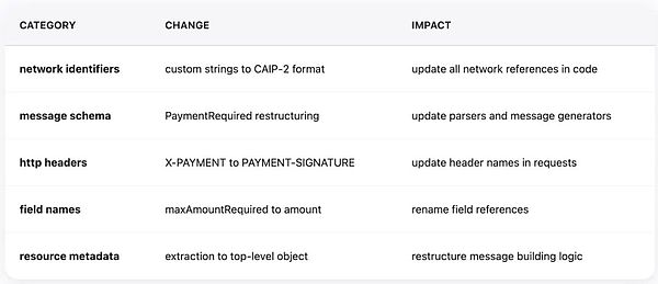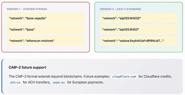 Die v1-Version verwendet benutzerdefinierte Netzwerkkennungen wie „base-sepolia“ und „base“.Die v2-Version übernimmt CAIP-2 (Chain-Independent Improvement Proposal 2) und das Format ist „namespace:reference“.Dadurch kann jede Blockchain unterstützt werden, auch Nicht-Blockchain-Zahlungssysteme.