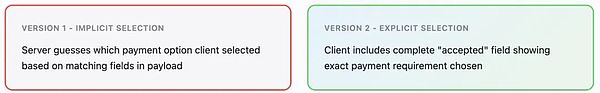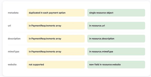 In der v1-Version sind die Ressourcenmetadaten in jeder Zahlungsoption dupliziert. Wenn der Server drei Token akzeptiert, wiederholt er die URL, die Beschreibung und den Inhaltstyp dreimal.Die v2-Version extrahiert es in ein gemeinsam genutztes Ressourcenobjekt, wodurch die Nachrichtengröße reduziert und Inkonsistenzen beseitigt werden.