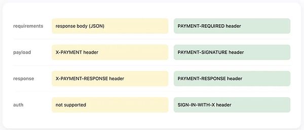 Die IETF hat das Präfix „X-“ für HTTP-Header abgelehnt, da experimentelle Header tendenziell zu De-facto-Standards werden, aber immer als experimentell gekennzeichnet sind. Version v2 entfernt diese Präfixe und verschiebt die Zahlungsanforderung vom Antworttext in den Header.Warum zum Header wechseln?Durch die Trennung von Protokollmetadaten und Anwendungsinhalten können Server benutzerdefinierte HTML-Paywalls an Browser zurückgeben und gleichzeitig maschinenlesbare Zahlungsanforderungen im Header beibehalten.Dies verbessert die Middleware-Kompatibilität und die Framework-Integration.