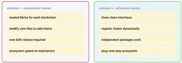 Die v1-Version des SDK bettet Blockchain-spezifische Logik in verschachtelte if/else-Ketten ein. Das Hinzufügen einer neuen Blockchain erfordert die Änderung der Kerndateien und die Veröffentlichung einer neuen SDK-Version.Die v2-Version führt drei Schnittstellen ein, um Plug-and-Play-Blockchain-Unterstützung zu erreichen.
