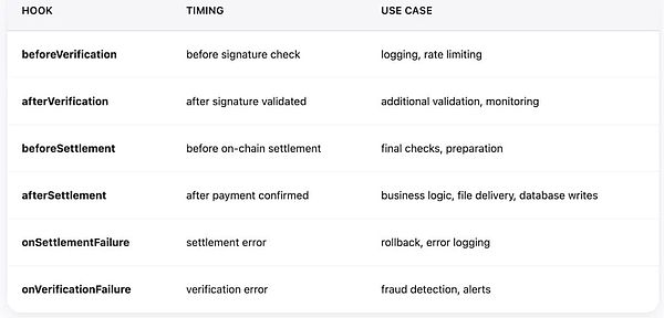 Die Version v1 führt die Geschäftslogik nach der Überprüfung und vor der Abrechnung aus.Wenn die Abwicklung fehlschlägt, hat der Server einen irreversiblen Vorgang durchgeführt (Dateiübertragung, API-Aufruf, Datenbankschreibvorgang).Die v2-Version führt sechs Lebenszyklus-Hooks ein.