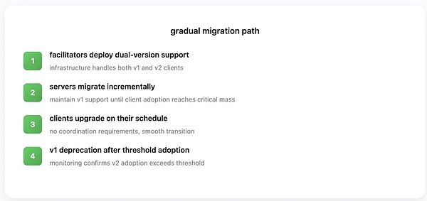 Die v2-Version gewährleistet die Abwärtskompatibilität durch Namespace-Isolation.Moderatorund Server können beide Versionen gleichzeitig unterstützen.Der Client gibt über das Feld x402Version eine Versionspräferenz an und die Implementierung antwortet mit einer passenden Protokollversion.
