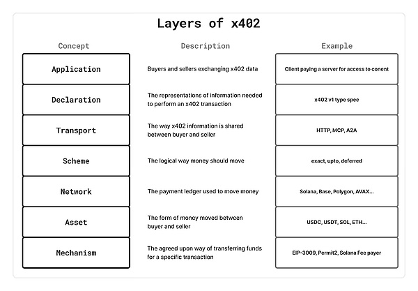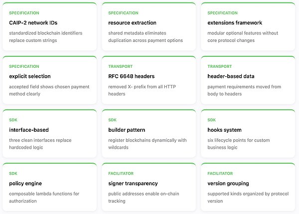 Die v2-Version des x402-Protokolls basiert auf Erfahrungen mit der Produktionsbereitstellung und stellt eine grundlegende Architekturänderung dar (bei Interesse können Sie sich die x402-Grundlage ansehen: https://www.x402.org/writing/x402-v2-launch). Nach der Verarbeitung von mehr als 100 Millionen Transaktionen identifizierte das Team die wichtigsten Reibungspunkte und gestaltete das Protokoll im Hinblick auf drei Ziele neu: klare Schichtentrennung, Blockchain-unabhängige Skalierbarkeit und Einhaltung von Webstandards.