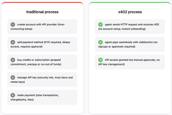 Herkömmliche Zahlungsprozesse erfordern mehrere manuelle Schritte und menschliches Eingreifen.x402 beseitigt Reibungsverluste, indem es autonome, sofortige Zahlungen ermöglicht.