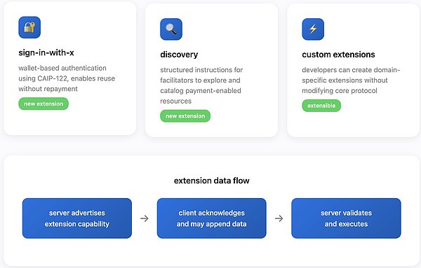 Version v2 führt ein formales Erweiterungssystem für optionale Funktionen ein, das unabhängig vom Kernzahlungsmechanismus funktioniert.Jede Erweiterung verfügt über ein Info-Objekt, das erweiterungsspezifische Daten enthält, und ein Schema-Objekt, das die Struktur über JSON Schema definiert.