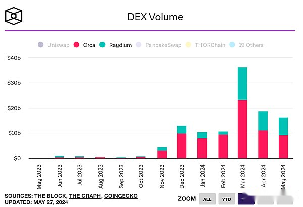 Es ist wichtig, dass wir sehen, dass das Wachstum des Austauschs in der Kette nicht dem Ethereum passiert.In Solana haben die beiden führenden Dex -ORCA und Raydium ebenfalls signifikant zugenommen: