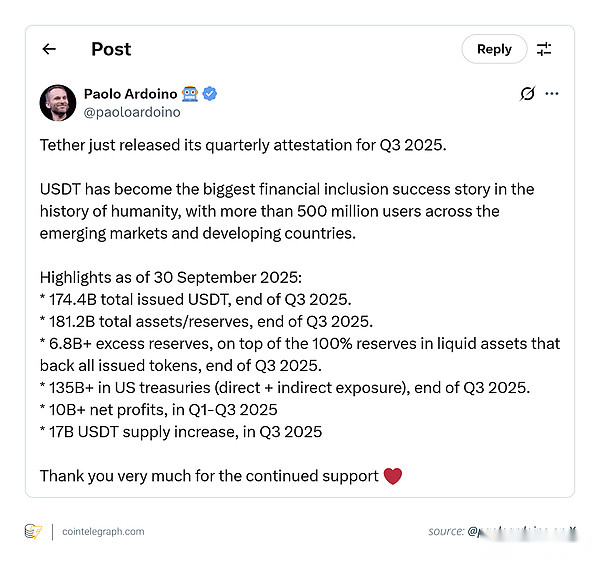 Third, in a high interest rate environment, it can obtain seigniorage-like benefits.Users hold interest-free tokens, while Tether collects interest on government bonds. As of the third quarter of 2025, Tether has achieved profits of more than $10 billion and excess reserves of $6.8 billion.It is this income that makes comparisons with “private central banks” persuasive.