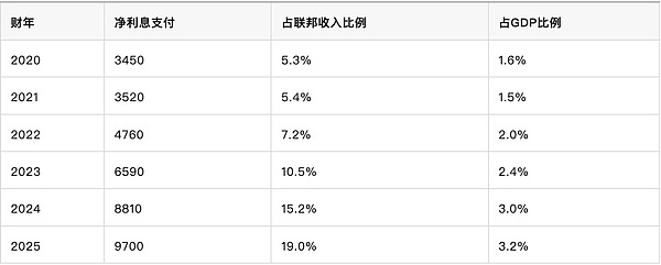 For visual display, the following table lists net interest payment data for fiscal years 2019-2025 (unit: billion U.S. dollars):