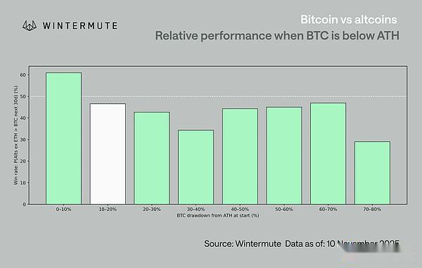 Based on the current trading situation of mainstream coins, it seems unlikely that the rising season of altcoins will come anytime soon.Judging from historical data, when mainstream currencies are close to historical highs, altcoins usually perform better, thus bringing about wealth spillover effects.When the price of Bitcoin is between 10% and 20% from its all-time high (currently 16%), the probability of Bitcoin outperforming altcoins is about 54%.When the price of Bitcoin drops to close to $100,000, the probability of Bitcoin outperforming altcoins even increases to about 58% based on historical data.
