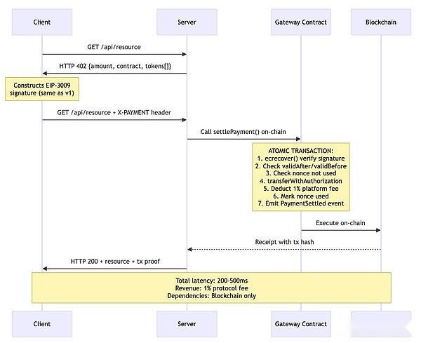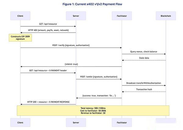 主な所見:この設計により、販売者が秘密鍵を処理したり、ブロックチェーン インフラストラクチャを直接管理したりする必要がなく、暗号化による支払い検証が可能になります。決済は Base (イーサリアム L2) などのネットワーク上で行われ、ファイナリティは約 200 ミリ秒、ガスコストは 0.0001 ドル未満です。このプロトコルはシンプルで洗練されているように見えますが、この表面的な単純さによって、よく調べてみないと明らかにならないいくつかの重大なアーキテクチャ上の問題が隠されています。