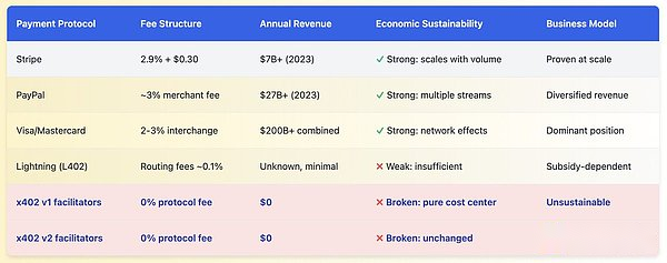 主な調査結果:インターネットの歴史の中で成功を収めたすべての支払いプロトコルと比較すると、Stripe は取引ごとに 2.9% + 0.3 ドルを請求し、PayPal は約 3% の加盟店手数料を請求し、クレジット カード ネットワークは加盟店の割引率を通じて 2 ~ 3% の収益を得ています。これらのプロトコルは価値を生み出し、トランザクションの規模に応じて拡張できる持続可能なビジネス モデルを確立するため、価値を獲得します。x402 リレー パーティは実際の値を提供しますが、見返りに値を取得することはできません。