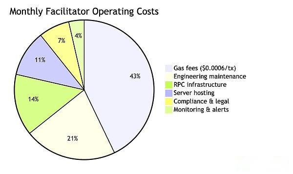 中継者は、EIP-3009署名検証、ブロックチェーントランザクションブロードキャスト、APIインフラストラクチャ提供の3つの機能を担う。ただし、プロトコル層は金銭的な補償メカニズムを提供しません。コストを正確に計算してみましょう。