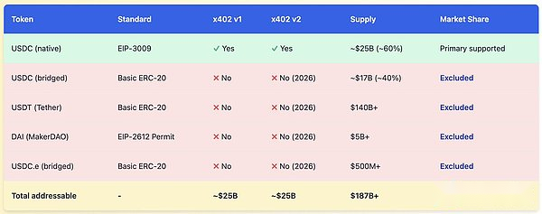 これは意味しますx402 v1プライマリターゲットコインを含むバージョン40%品種によっては相性の問題もあります。他のステーブルコインの互換性状況はさらに深刻です。テザー (USDT) は、流通額が 1,400 億米ドルを超える最大のステーブルコインですが、EIP-3009 標準をサポートしたことがなく、関連する計画もありません。 DAI ステーブルコインは EIP-2612 ライセンス標準を採用しています。機能は似ていますが、インターフェイスの違いにより、プロトコル層での非互換性が生じます。