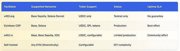 各リレーラーはネットワークの異なるサブセットをサポートしており、構成要件、トークン リスト、運用の成熟度に違いがあります。このプロトコルには、クライアントが「この販売者がどのチェーンをサポートしているか」をクエリするための検出メカニズムがありません。サーバーは 402 応答で単一のネットワークのみを指定できるため、クライアントは特定のチェーンに資金を保有するか、トランザクションを放棄するかのどちらかになります。