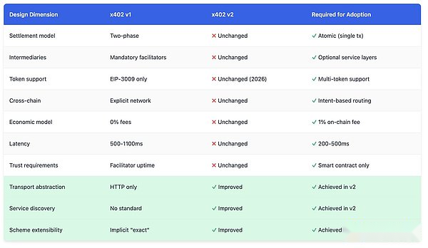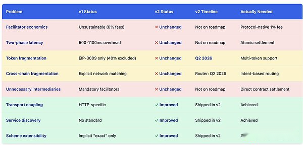 x402 チームは、「トランスポート層に依存しない再設計」を通じて v1 の制限の一部に対処するために、v2 仕様ブランチをリリースしました。v2 の更新ログ、ロードマップ、および仕様文書を検討した結果、著者は、v2 は漸進的な改善を達成しているものの、上記の基本的なアーキテクチャ上の問題は解決できていないと考えています。