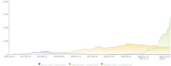 現在最大のシールド プールである Orchard は、2022 年 5 月 31 日に開始されました。これは、Halo 2 プルーフ システムを使用して、Sapling や Sprout などの古いプールを置き換えます。これにより、信頼できるセットアップ リンクが排除されるだけでなく、統一されたアドレスを通じてユーザーの操作が簡素化されます。現在、オーチャードのプールには 400 万個を超える ZEC (総流通量の約 25% を占める) が収容されており、これは合計約 490 万個のシールドされた ZEC の絶対多数を占めています。